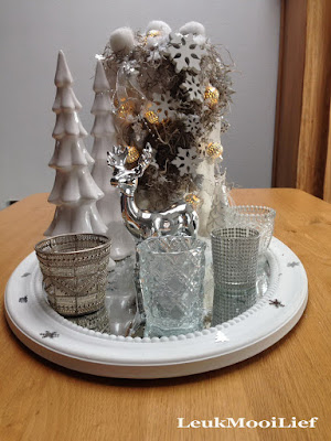 Deze glazen stolp met houten plateau is helemaal hip en ontzettend veelzijdig. Door steeds iets anders onder te zetten, kun je eindeloos variëren en heb je toch steeds iets nieuws staan. Nu is de stolp natuurlijk in kerstsfeer met een houten kerstboom en dennentakjes opgemaakt.